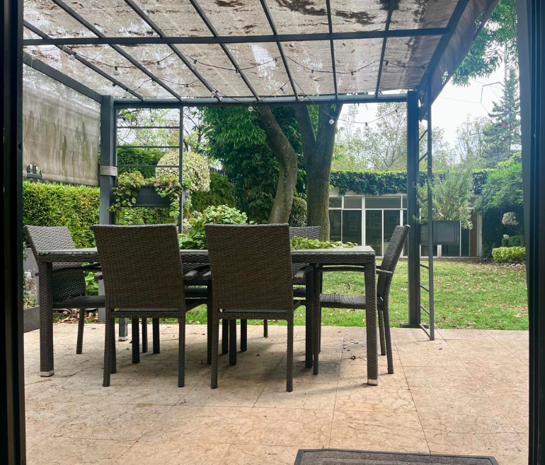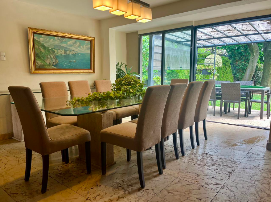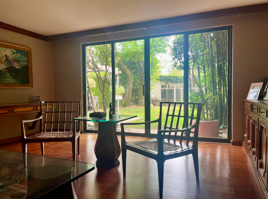 La propiedad cuenta con dos frentes y un hermoso jardín arbolado, que brinda iluminación natural y amplios espacios exteriores. Originalmente la casa contaba con tres recámaras; actualmente tiene cuatro, una de las cuales puede eliminarse o integrarse nuevamente, según las necesidades del comprador.